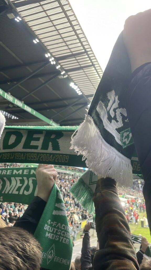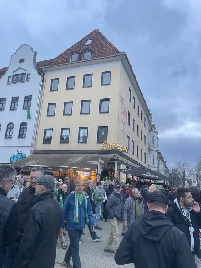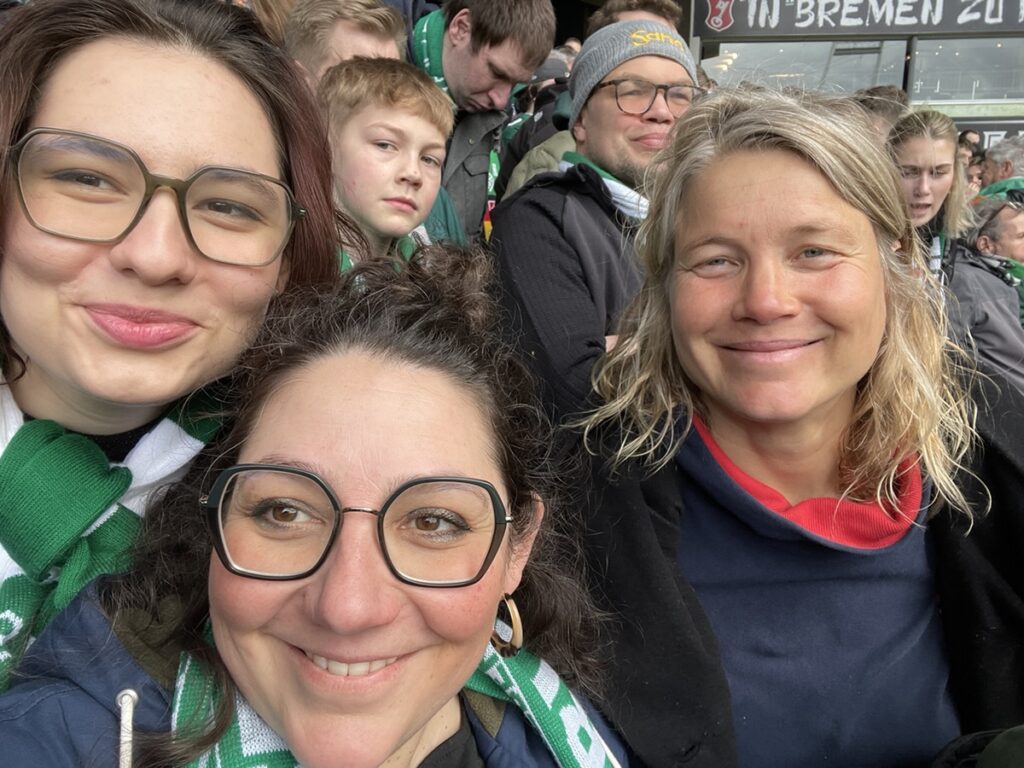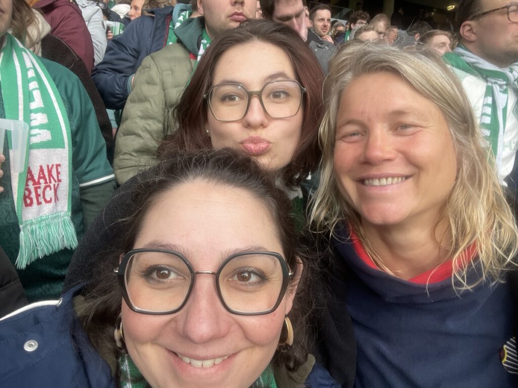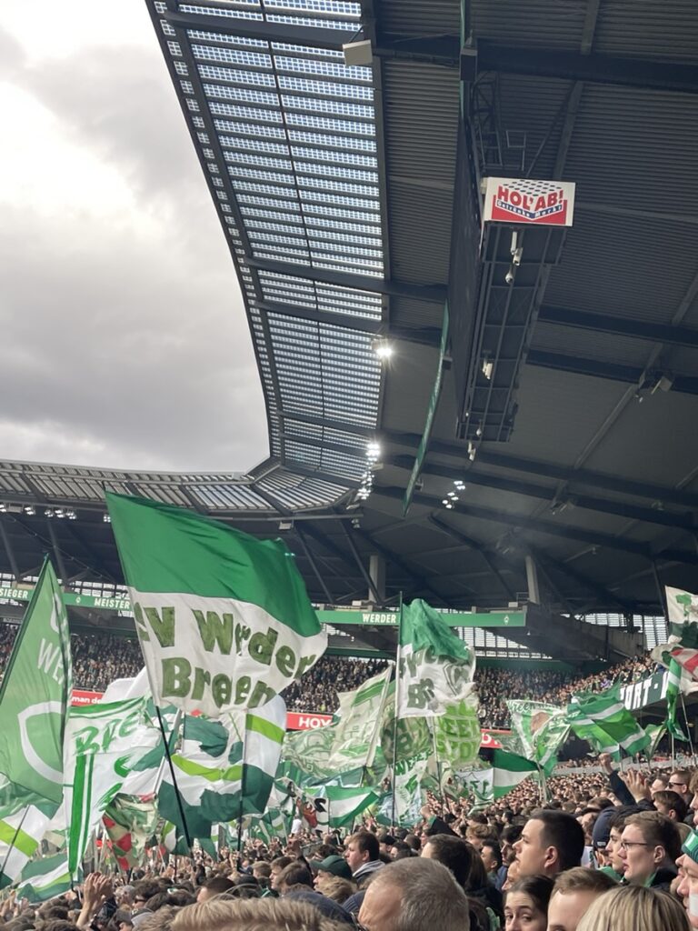 On les récupère ensuite pour courir à la gare et choper un train pour Brême où nous devons visiter le Weser Stadion. Confortablement installés dans le train: alerte à la bombe dans la gare de Brême, tous les trains restent où ils sont… vite, le plan B: une glace au son des chants de supporters! 🥳