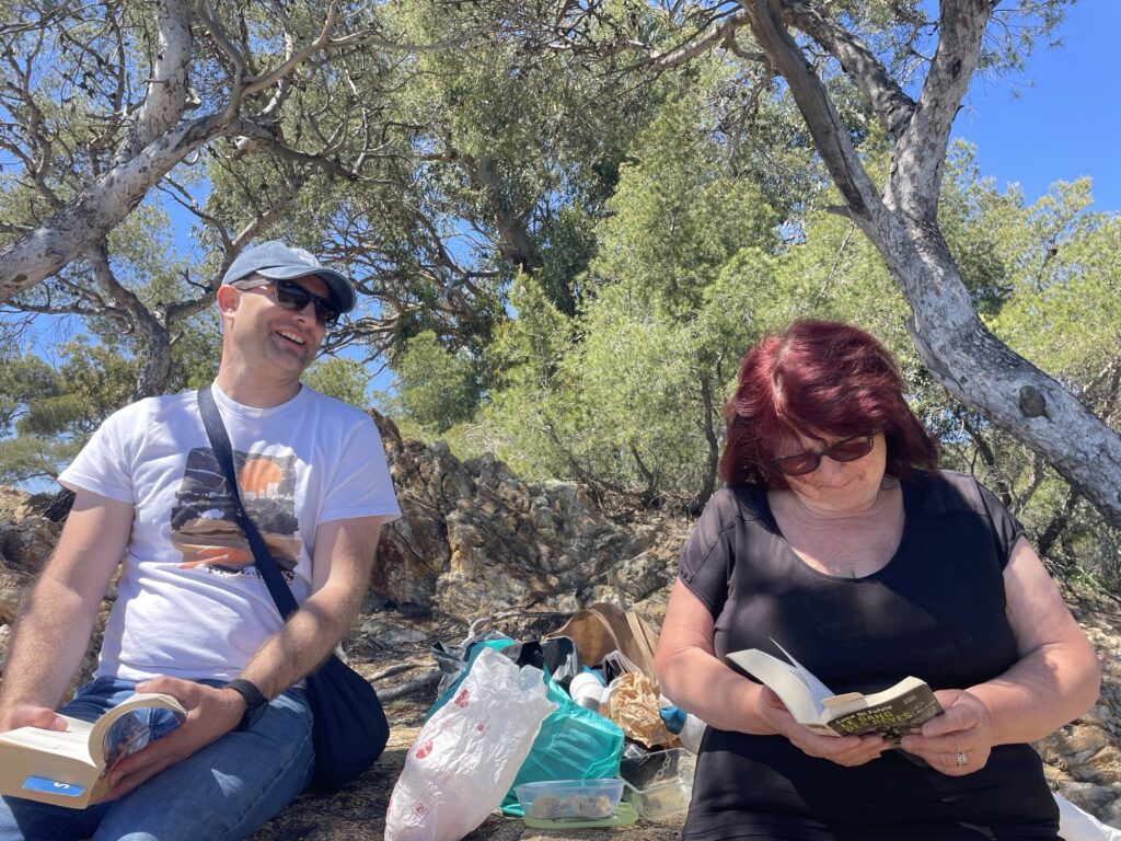 Arrivés sur la plage… c’est naturiste! Et Octave n’est pas chaud pour manger avec les tout-nus… 🤷🏻‍♀️