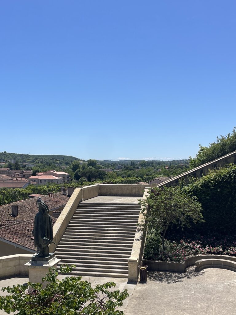 Moi je me dis qu’il fallait être très ingénieux pour relier les deux villes, haute et basse! Et bien figurez vous que lors du coup d’état de 1851, le préfet deporte 338 auscitains qui s’étaient insurgé et dans le même temps, il décide de se rallier les rebelles en leur offrant…. Du travail! Et oui, tiens de mieux que de mettre les oisifs au boulot! On décide alors, dans l’entaille de la colline, avec 35 mètres de denivellé, de construire un escalier de toute beauté avec ses 374 marches!