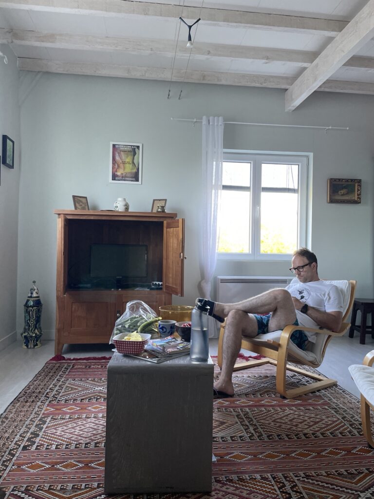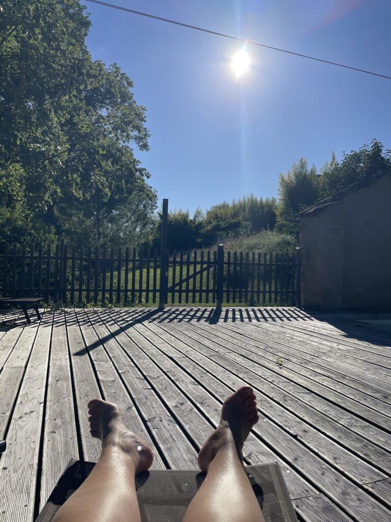 Retour au gîte après avoir récupéré qq légumes et fruits au distributeur de la ferme… et séance lecture-bronzage!