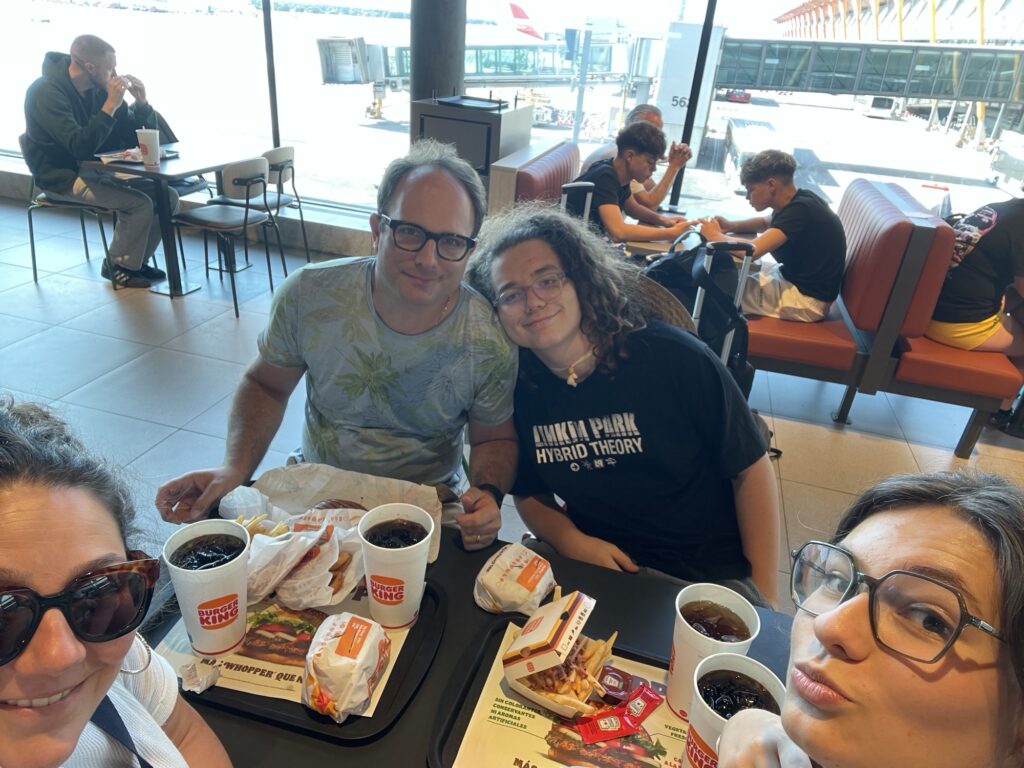 On a un 1er vol Iberia de 55 minutes pour Madrid, on rencontre des copains contrôleurs aériens qui vont à Lima, on discute on papote et il est déjà l’heure… de manger un bon Burger King des familles à 10h45 vue sur les pistes!