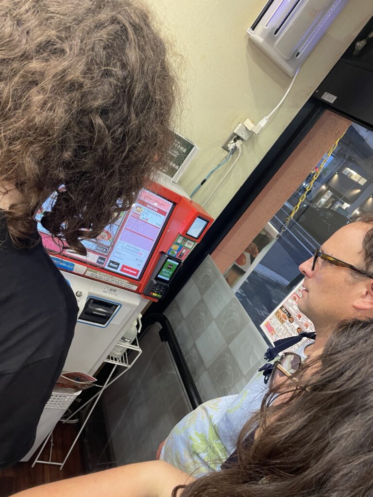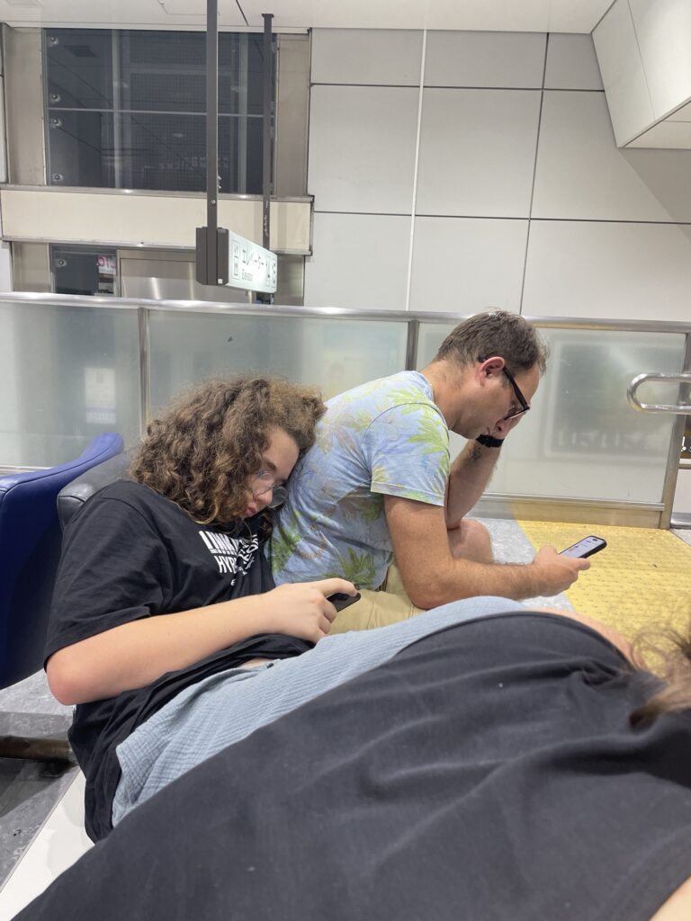 de trouver une waiting room où on peut échapper à la chaleur torride (on a mis une appli pour les catastrophes naturelles, très utile au Japon! Et elle annonce une alerte « chaleur ») et j’arrive même à acheter 4 onigiri simple, sans poisson pour caler tout le monde!