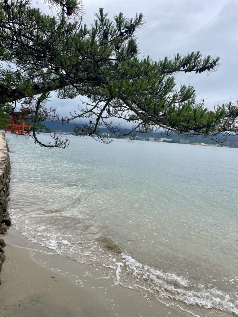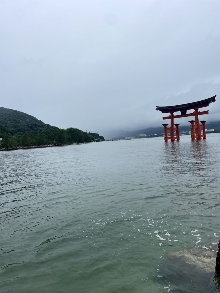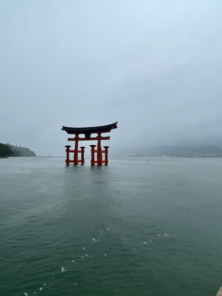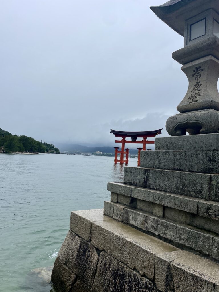 Lundi matin, on doit quitter l’hôtel à 10h avec la dernière navette et on décide de retourner au torii, comme attirés par sa sérénité… et comme il pleut, la forêt humide renvoie des paquets de brume vers la mer, l’ambiance est un peu irréelle… il y a peu de touristes car le temps est maussade, un typhon se dirige sur Tokyo, traînant dans son sillage de fortes pluies…