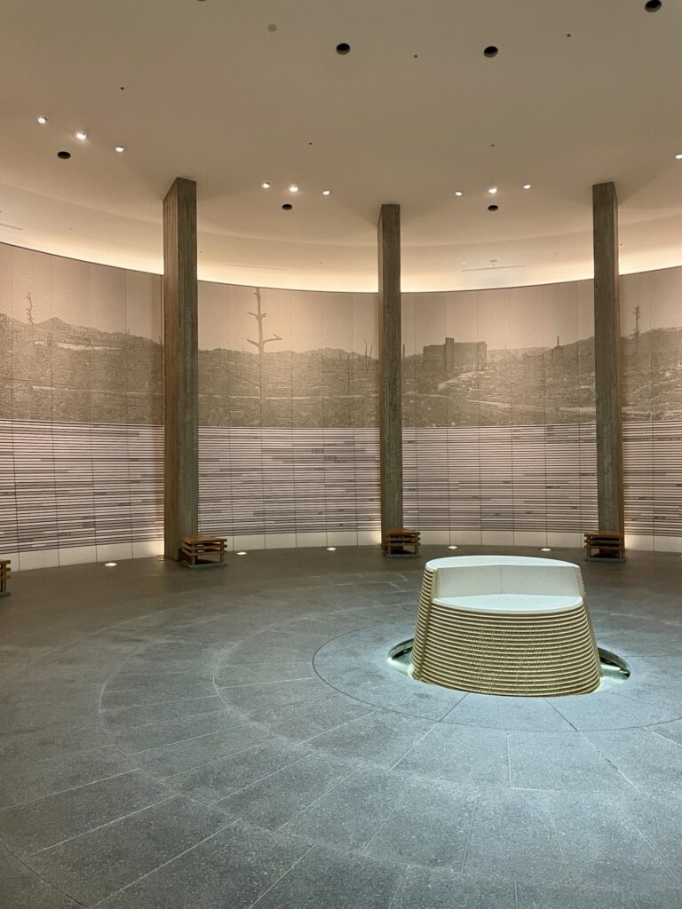 Comme on en veut encore, on va au mémorial des victimes à 2 pas. Une vaste salle circulaire qui représente le rayon de 2km sur lequel tous les quartiers ont été rasés… constituée de 140 000 carrés de granit symbolisant les 140 000 victimes. Au centre, une fontaine évoque l’hypocentre de l’impact et le bruit de l’eau se répercute sur les murs, l’acoustique est impressionnante.
