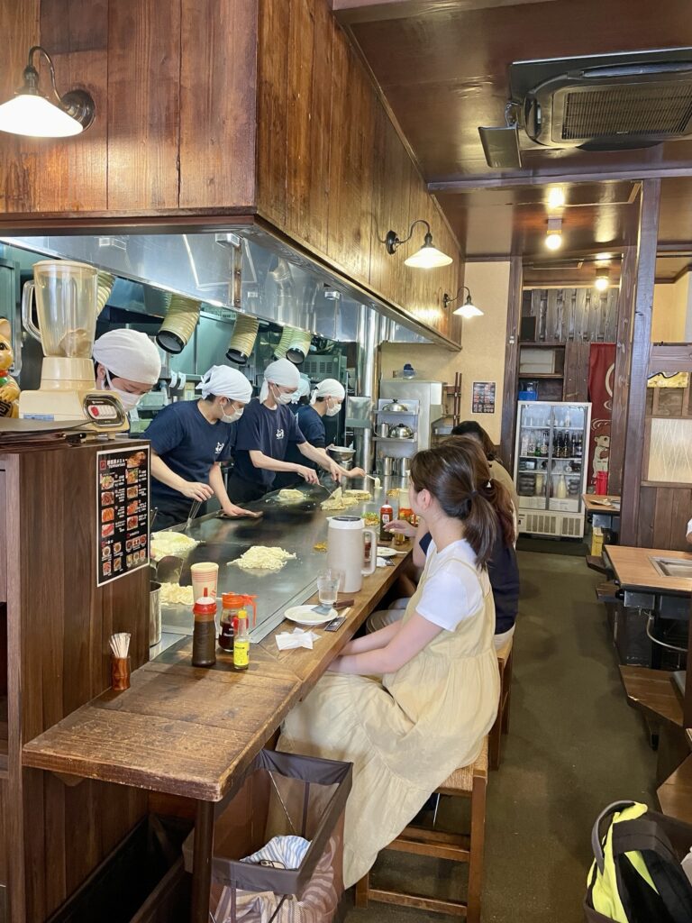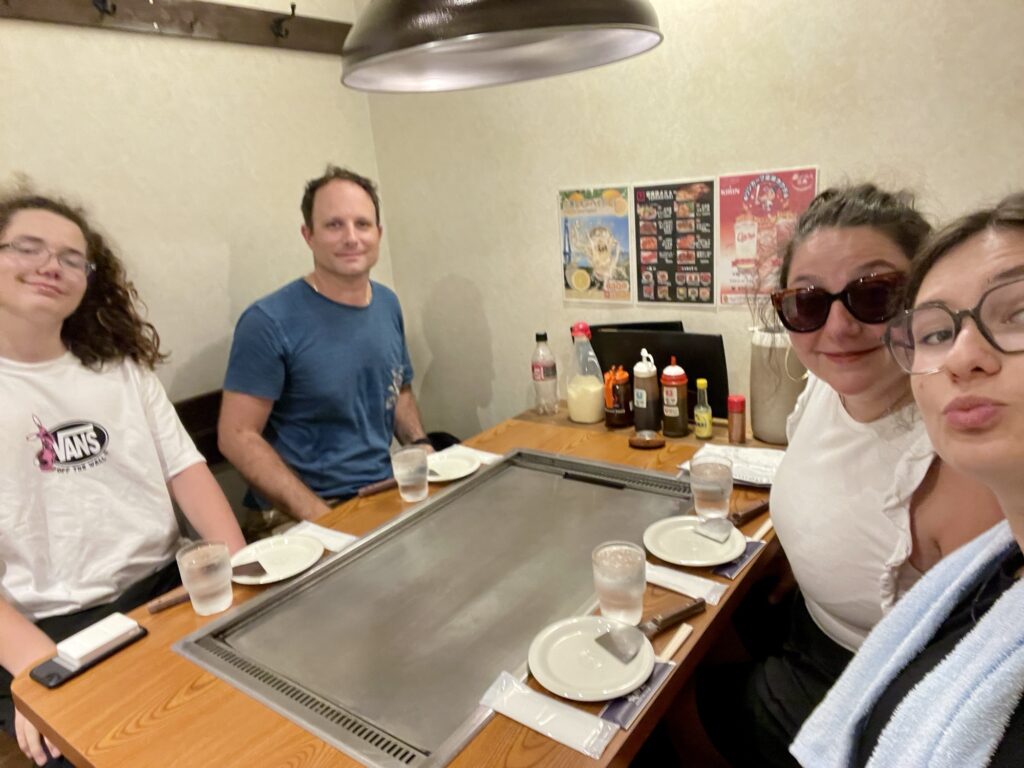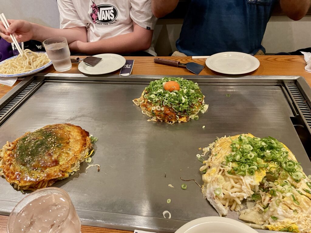 Après la visite, on est tous un peu groggy alors on décide d’aller déguster la spécialité du coin: une okonomiyaki: une omelette avec des pâtes! Dit comme ça, ça n’a pas l’air fou mais c’est une tuerie! En plus, on a un petit salon privé pour nous tous seuls!
