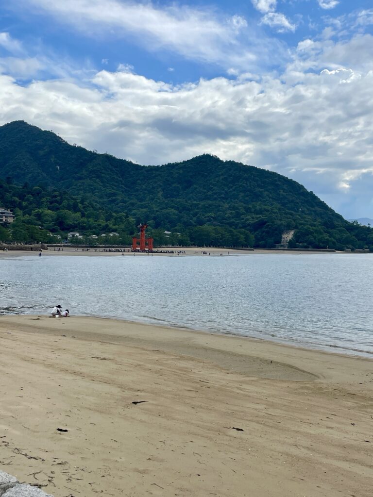 Sauf que lorsque l’on arrive… c’est marée basse! Le tori est sur la plage et des milliers de touristes sont agglutinés dessous!