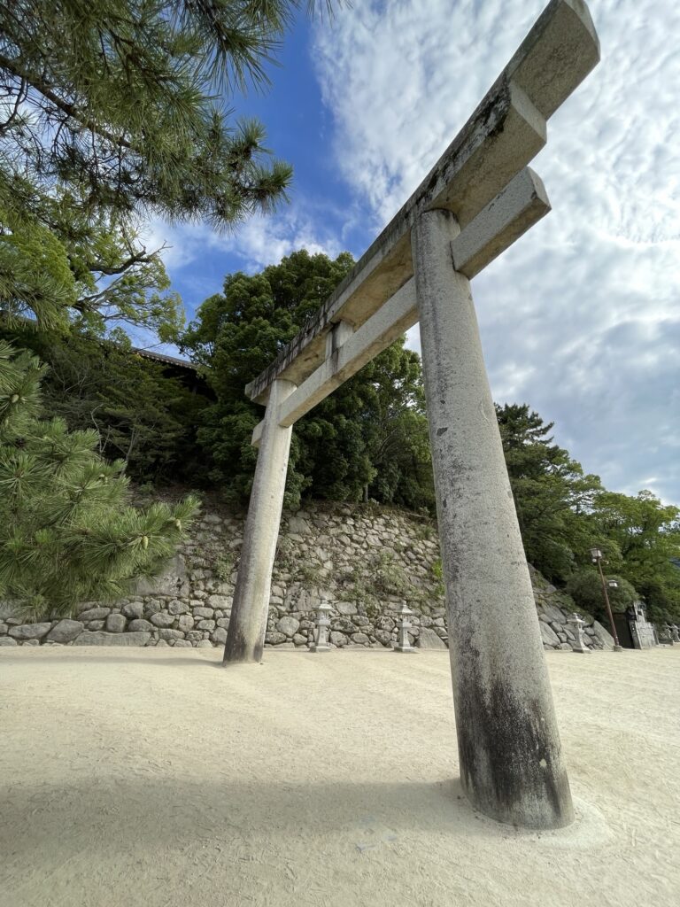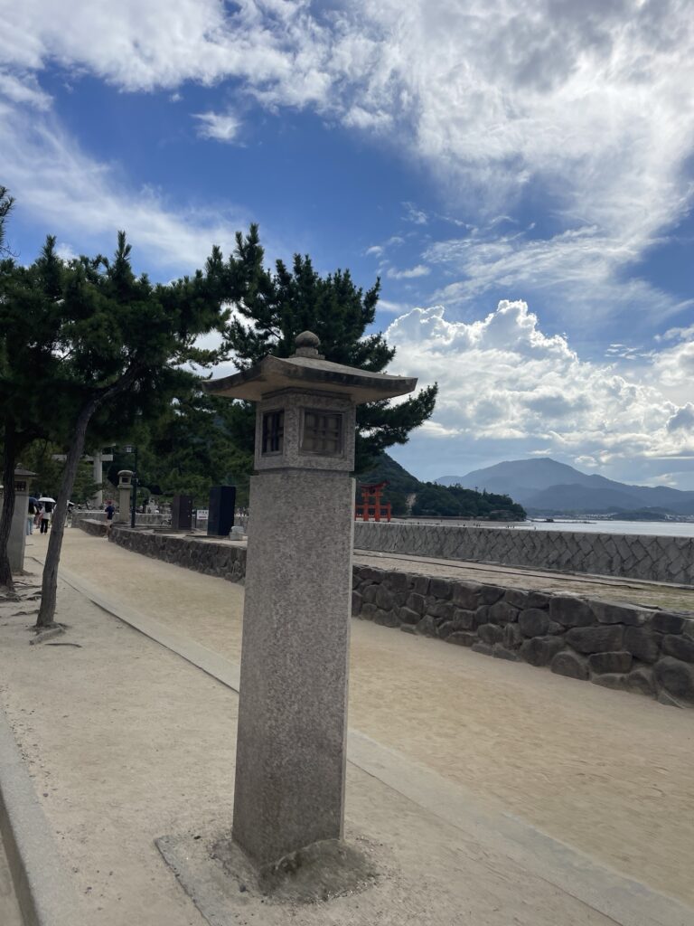 On croise un premier temple sur pilotis (mais c’est marée basse) que l’on décide de ne pas visiter. C’est un sanctuaire shintô (l’île est entièrement dédiée à ce culte) qui commence avec le torii flottant.