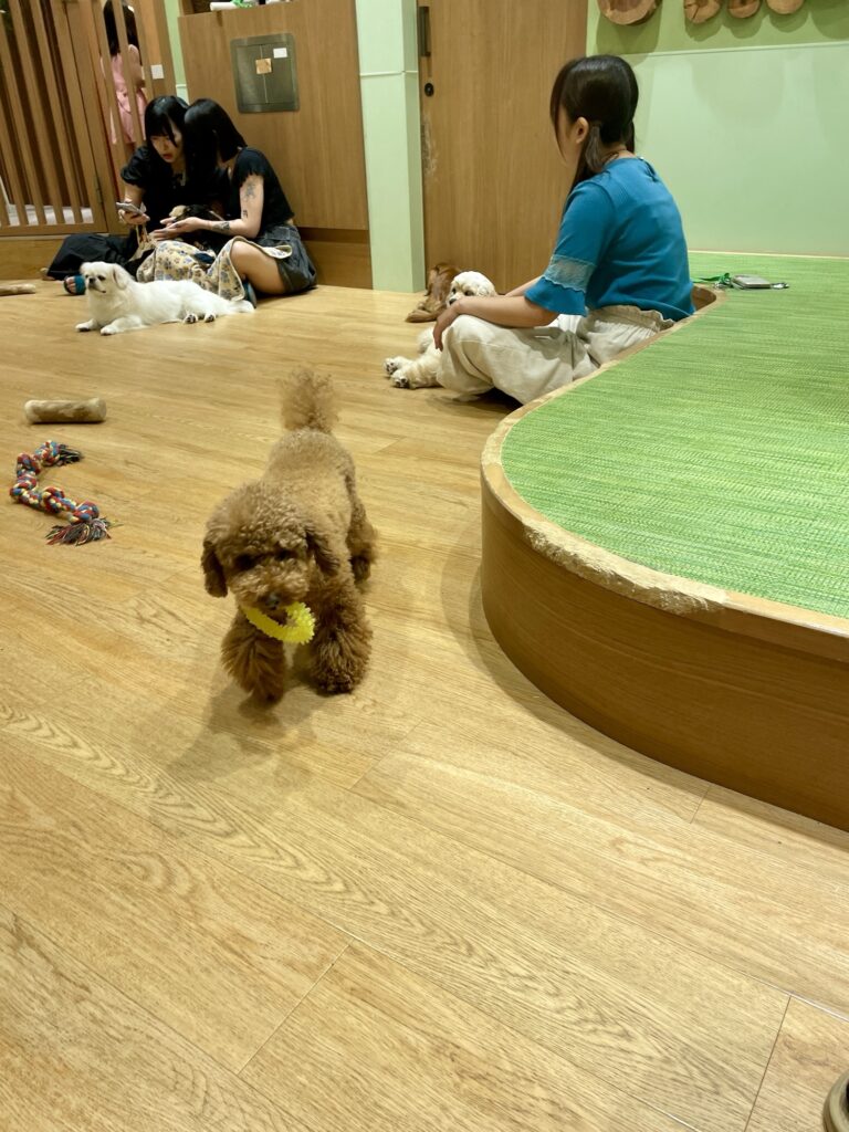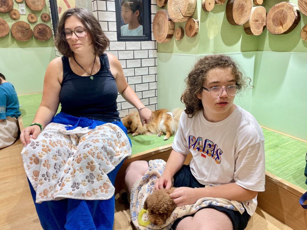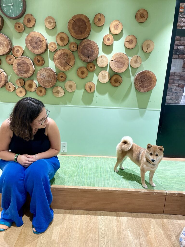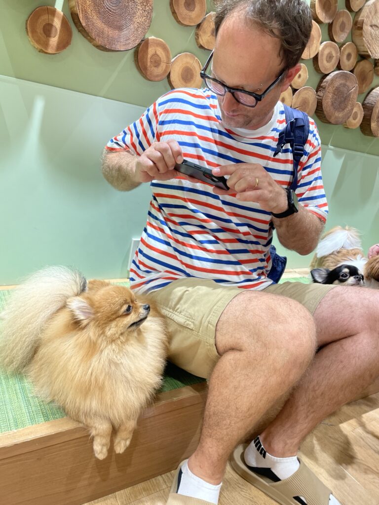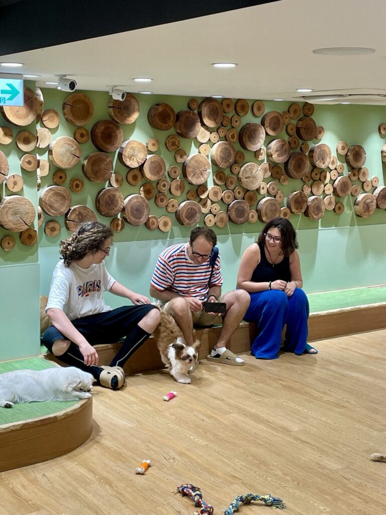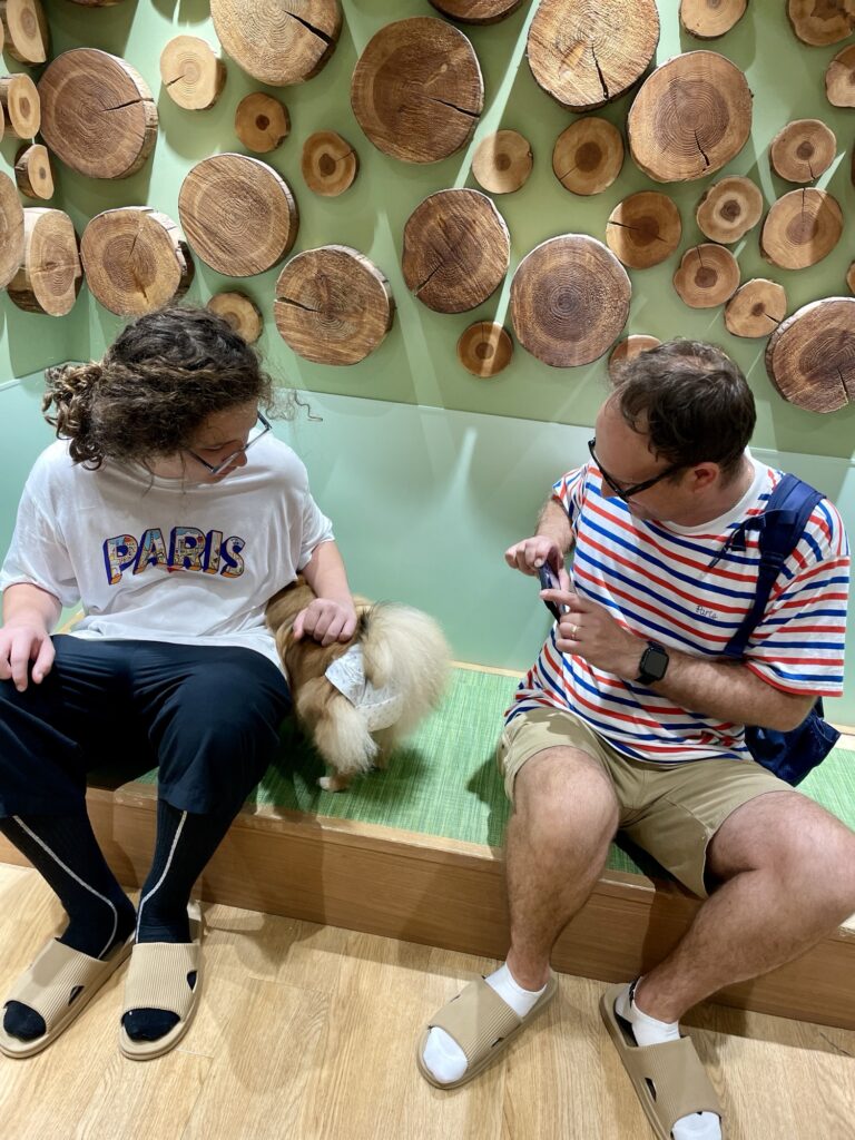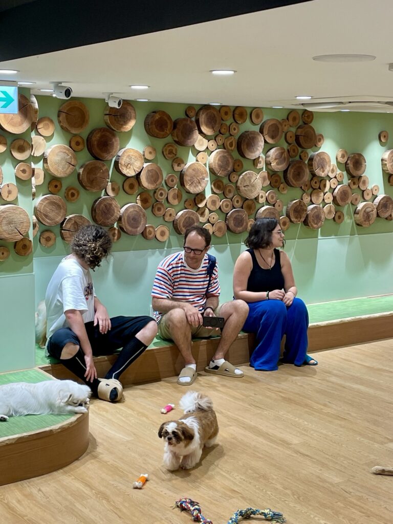 Bon finalement, on a longtemps hésité pour aller boire un coup dans un bar à hôtesses… et on a croisé un autre cliché que les enfants voulaient tester: un bar à chiens! Au départ ils étaient partis sur un capibara café mais je n’étais pas motivée… et on s’est dit que 20€ pour accéder à leur rêve, c’était raisonnable 😂