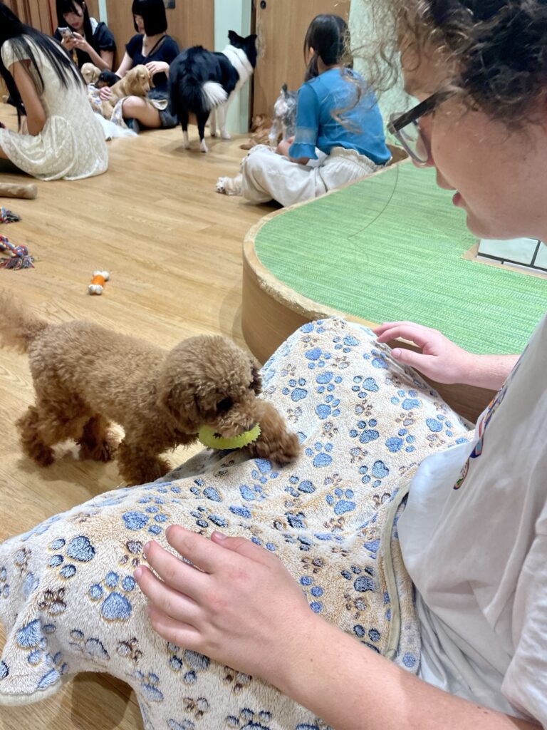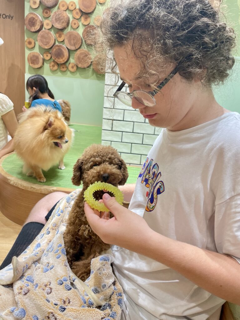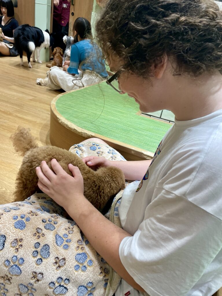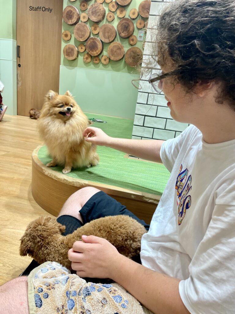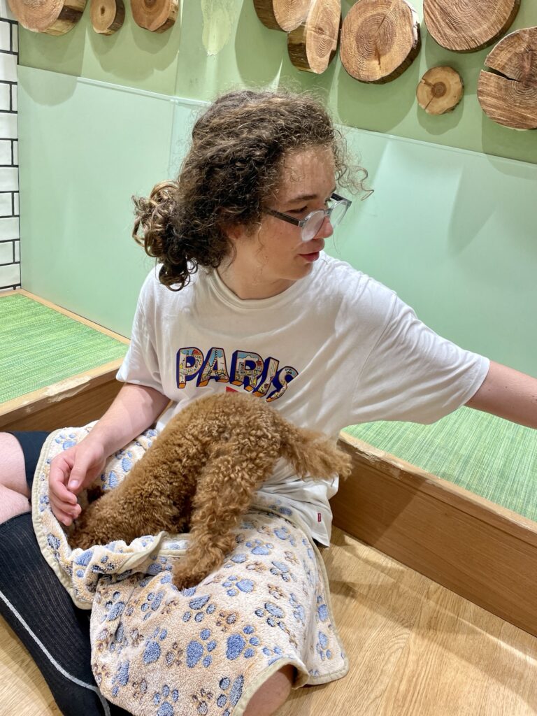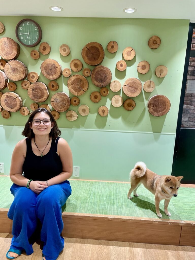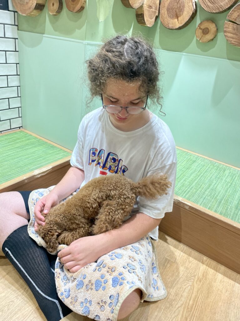 Bon finalement, on a longtemps hésité pour aller boire un coup dans un bar à hôtesses… et on a croisé un autre cliché que les enfants voulaient tester: un bar à chiens! Au départ ils étaient partis sur un capibara café mais je n’étais pas motivée… et on s’est dit que 20€ pour accéder à leur rêve, c’était raisonnable 😂