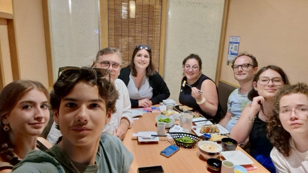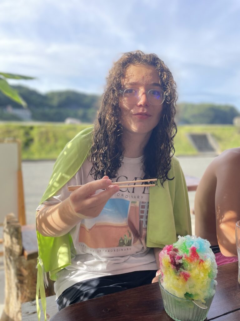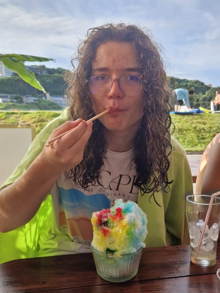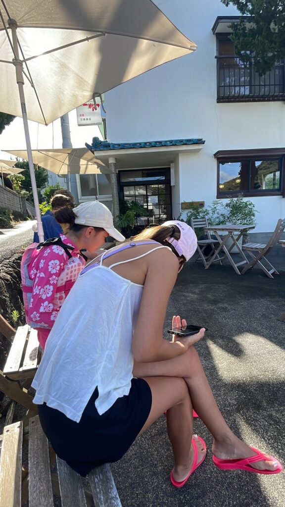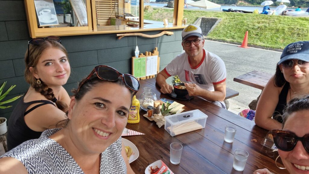 On s’est retrouvé pour une glace vers 16h au café de la plage! les gars ont passé l’aprem dans l’eau et ont rencontré des Anglo-japonais avec qui ils ont lié connaissance à la façon des ados… « tu sais comment on dit chibre??? » 😭😭😭