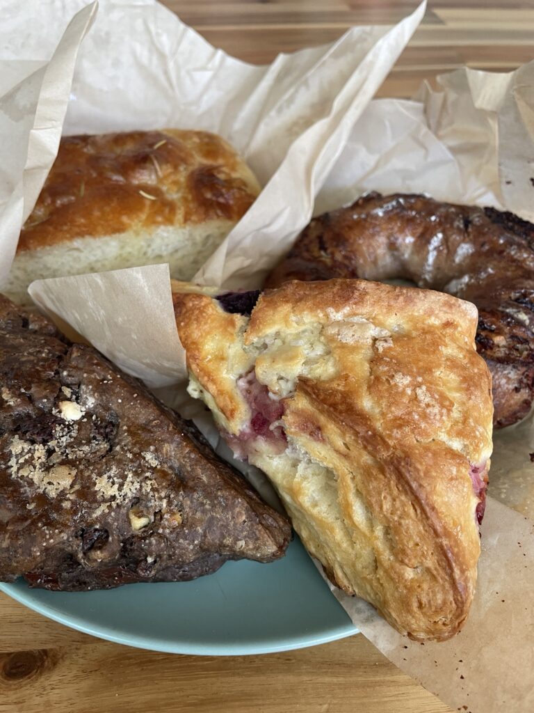 On a trouvé une boulangerie « chez Doug », où les gens font la queue dehors WTF 😳… car Doug n’autorise qu’une personne à la fois dans son antre! Et on se déplace de banc en banc à mesure que la queue avance!