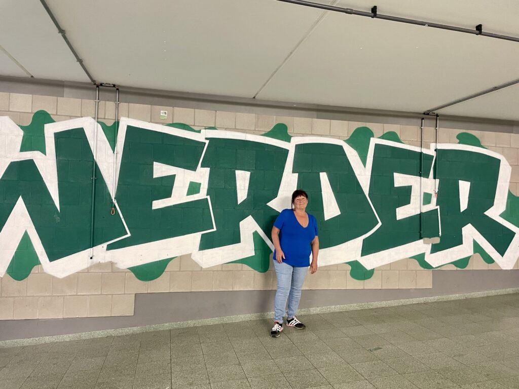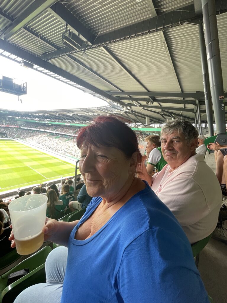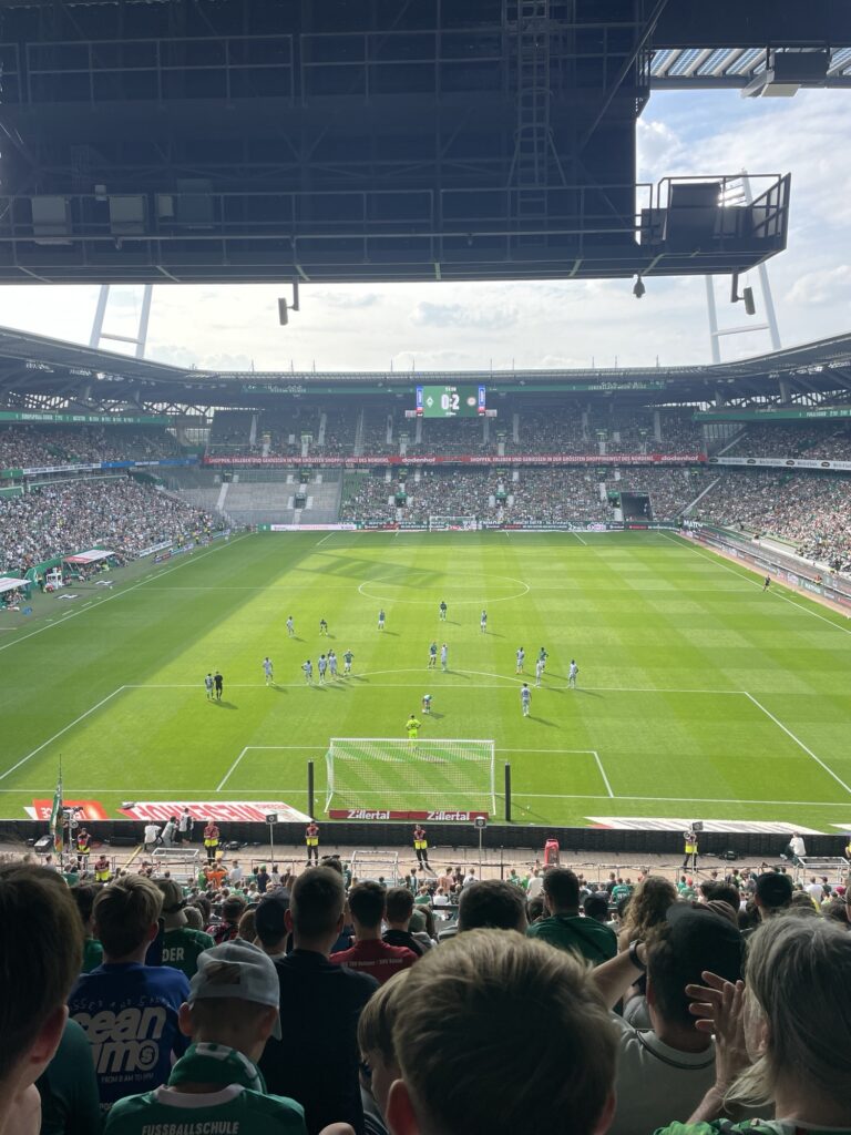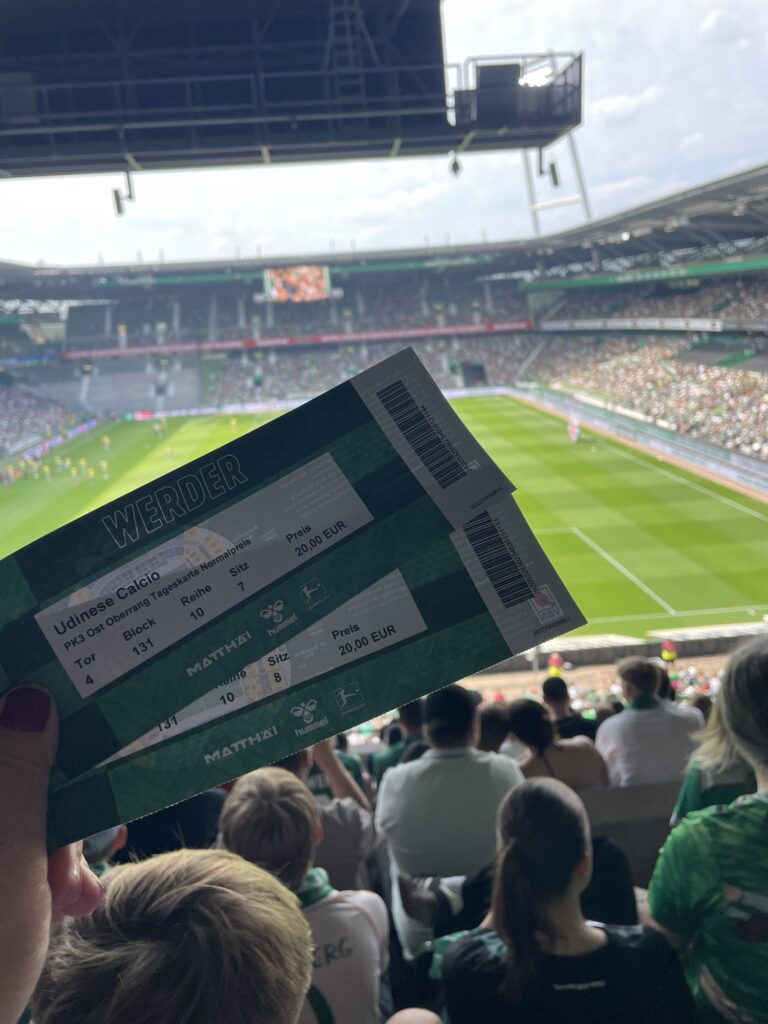 Donc on a décidé de rentrer à pied par la Weser et là, en approchant le Weserstadion, des cris de ferveur arrivent à nos oreilles… le Werder (l’équipe de Brême) joue à 15h30 en match amical contre Udinese!!! Et il est 15h… Louise demande s’il reste quatre places assises côte à côte…. Et la réponse est OUIIIIIII!!!