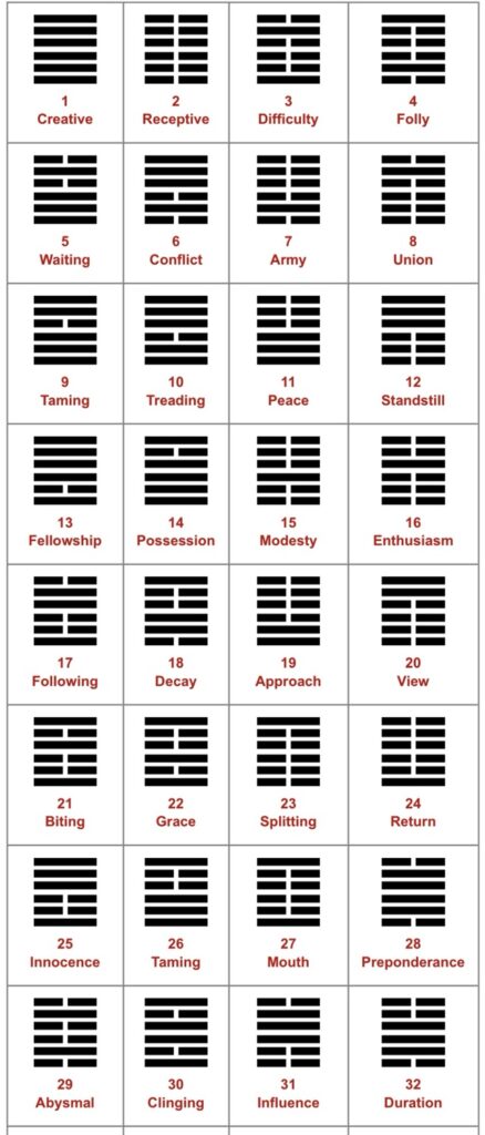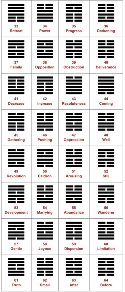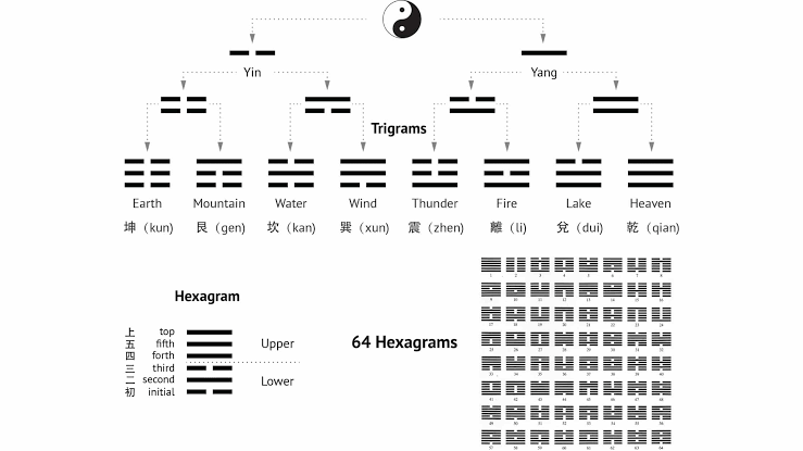 Le terme gua (trigramme) désigne un « modèle » d’harmonie naturelle, représenté par les huit combinaisons formées par la structure à trois niveaux des deux signes du Yin et du Yang. Ces combinaisons sont appelées bagua, et la combinaison de deux bagua, l’un placé au-dessus et l’autre en dessous, permet de créer un total de 64 hexagrammes, ou 64 modèles uniques. Les « soixante-quatre trigrammes » sont formés par la combinaison de ces deux bagua.