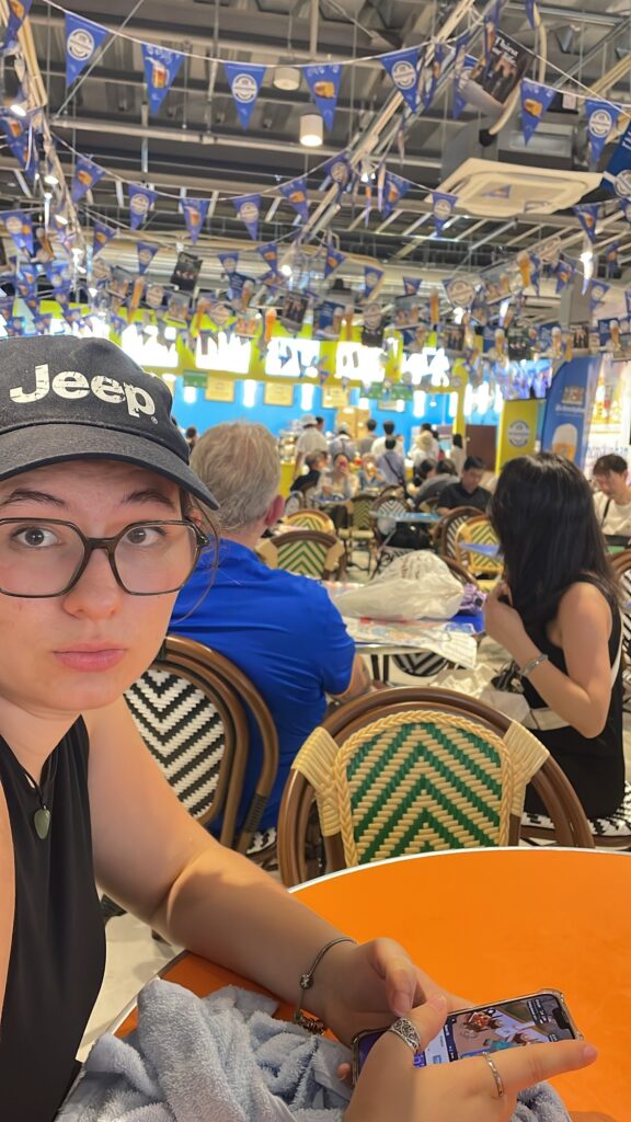À 15h, on est au bout de notre fatigue! Chaleur, jetlag, on cherche un café climatisé… ERREUR MONUMENTALE: tout le monde mange! Tout est plein… 🫣