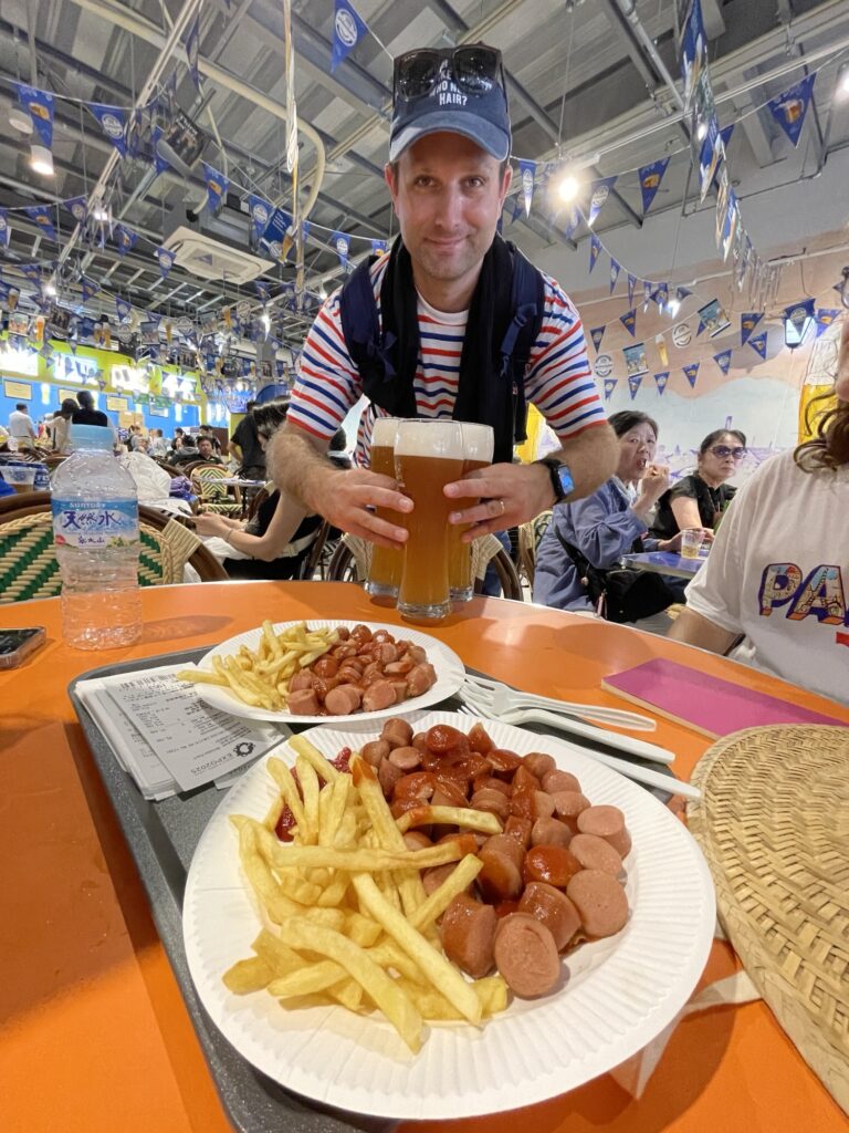 Louise et moi faisons la queue en plein soleil pour le wine bar du pavillon de Monaco 😂 et miraculeusement, Guillaume nous dégotte une table… dans une taverne bavaroise 😂😂😂. Notre Heimat!